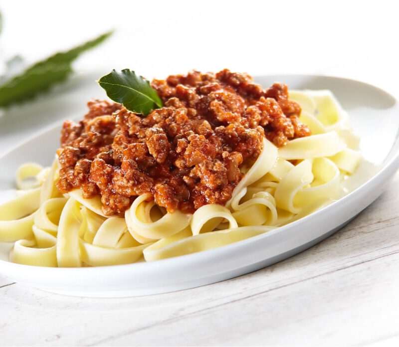 Pasta con salsa boloñesa vegana con soja texturizada